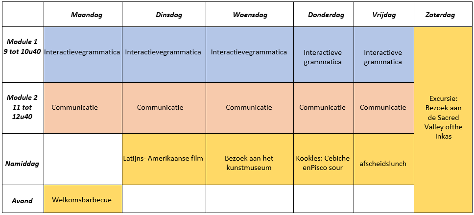 Dit programma omvat 10 lessen per week, die meestal plaatsvinden in de ochtend in kleine groepen van maximaal 7 studenten (gemiddeld 4) – deze grootte van de klas zal een persoonlijkere cursus garanderen. De studenten worden op de eerste dag van de lessen geëvalueerd met een schriftelijke en mondelinge test, waardoor we hun voorkennis van het Spaans kennen, en ze op het juiste niveau kunnen indelen. Met dit programma zal de student kiezen tussen een van de twee modules: Interactieve grammatica of de conversatie en communicatie-module, afhankelijk van hun behoeften.